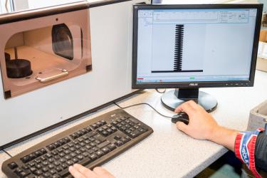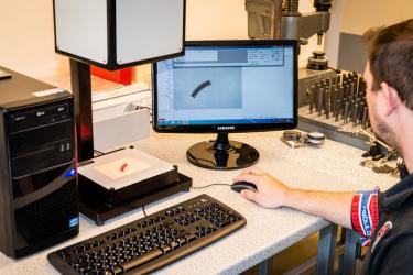 Our QS uses modern camera systems. This makes inspecting complicated bending parts and leaf springs much easier and more precise. In this example, the bend radius of a bow spring is being measured. The camera system enables a very precise measurement of the bend radius and significantly speeds up the measurement process.